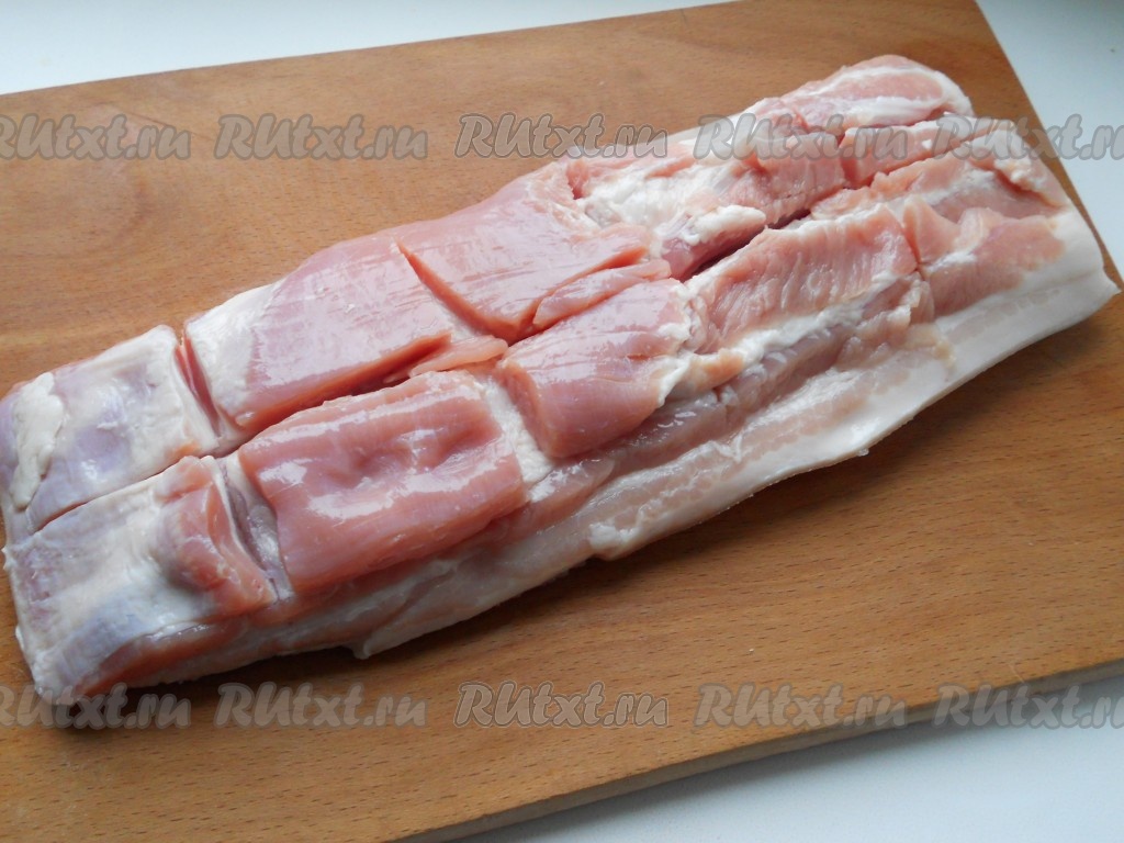 Лук очистить. Свиную грудинку помыть, обсушить бумажными полотенцами. Сверху, крест на крест, сделать надрезы острым ножом (если грудинка без костей), как на фото.
