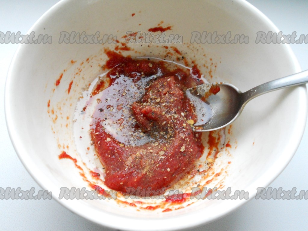 К томатно-медовой смеси добавить растительное масло, соль, чёрный молотый перец, хорошо перемешать.