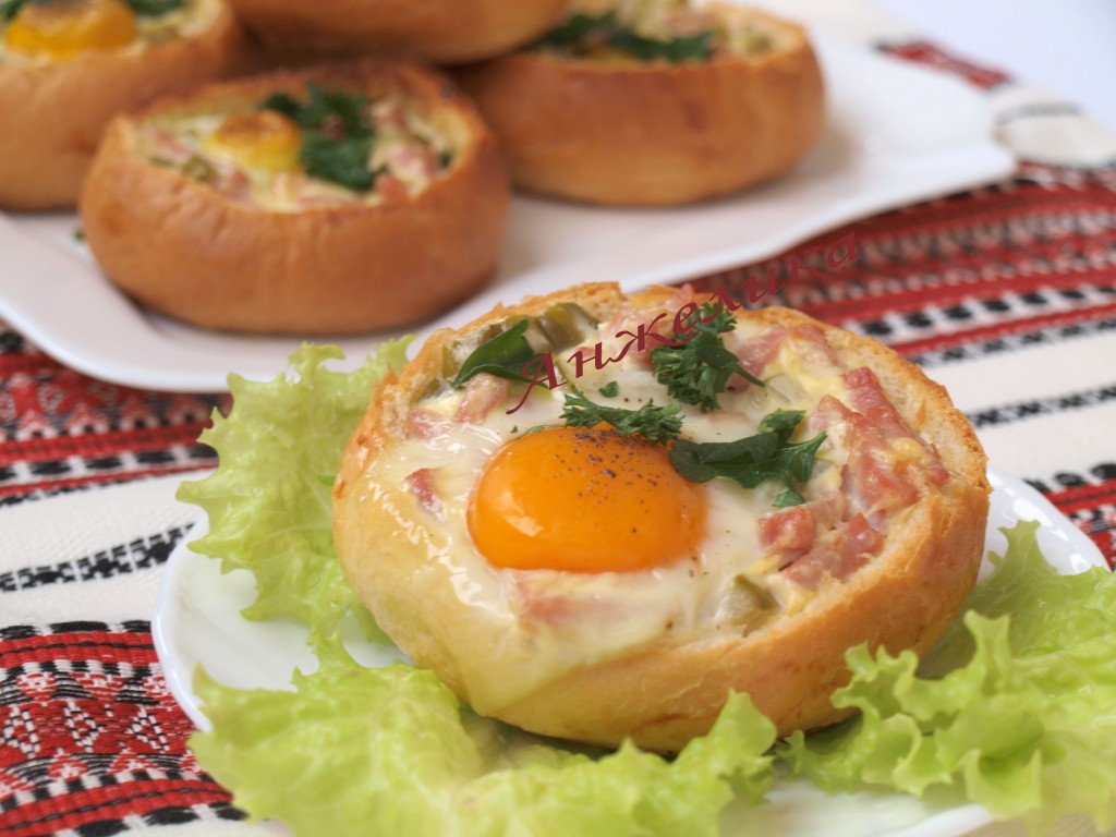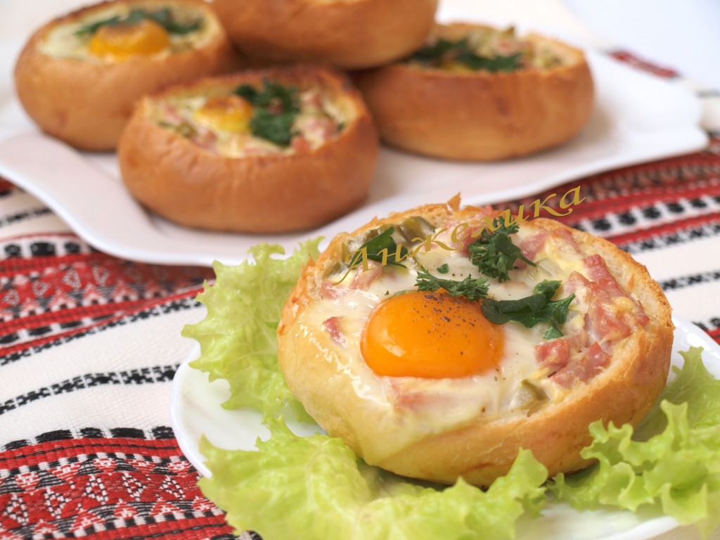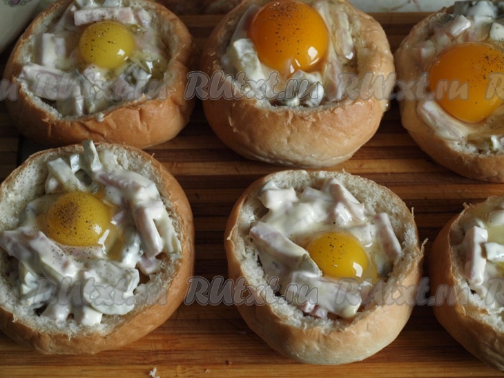 Каждую булочку изнутри смочить половиной столовой ложки молока и смазать сливочным маслом. Добавить начинку из ветчины и огурца, посыпать порезанной зеленью. В каждую булочку вбить по яйцу (если Вы будете готовить с куриными яйцами, то берите не крупные). Желтки посыпать солью и перцем.