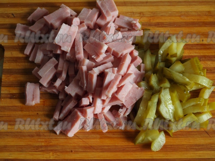 Нарезать соломкой ветчину и огурцы. Затем смешать их с майонезом и горчицей.