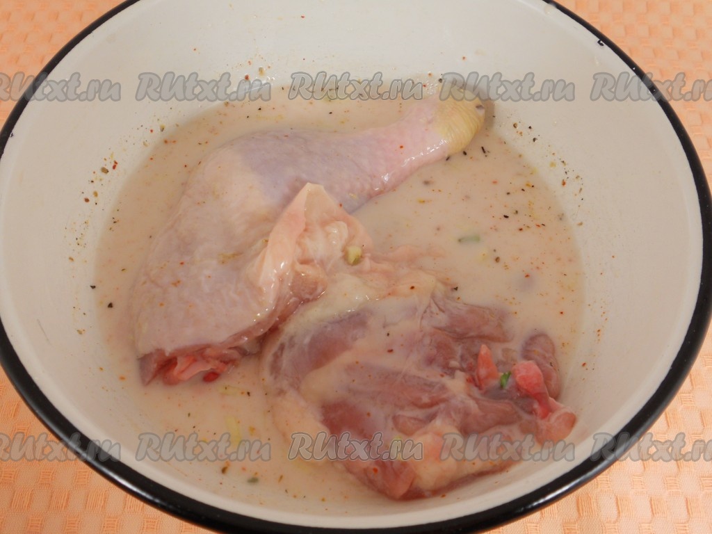 Куриные окорочка вымыть, обсушить, сделать по несколько прорезей в мясе и поместить в кефирный маринад (маринад должен почти полностью покрыть окорочка). Накрыть миску пищевой пленкой и поместить в холодильник на ночь. Можно замариновать окорочка прямо в целлофановом пакете.