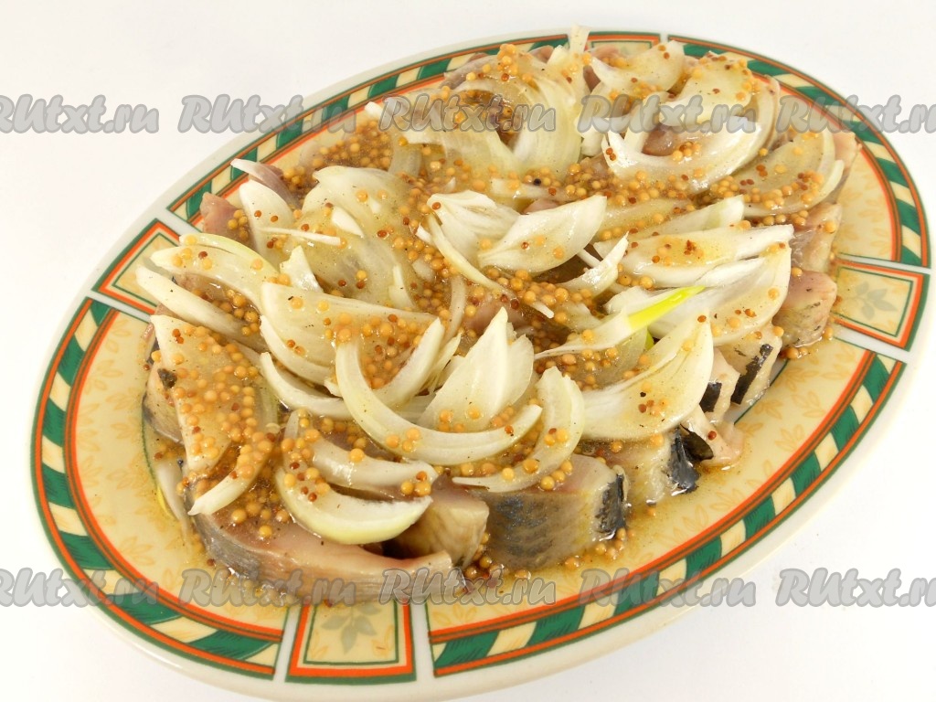 Равномерно полить селёдку получившейся заправкой с горчицей и уксусом.