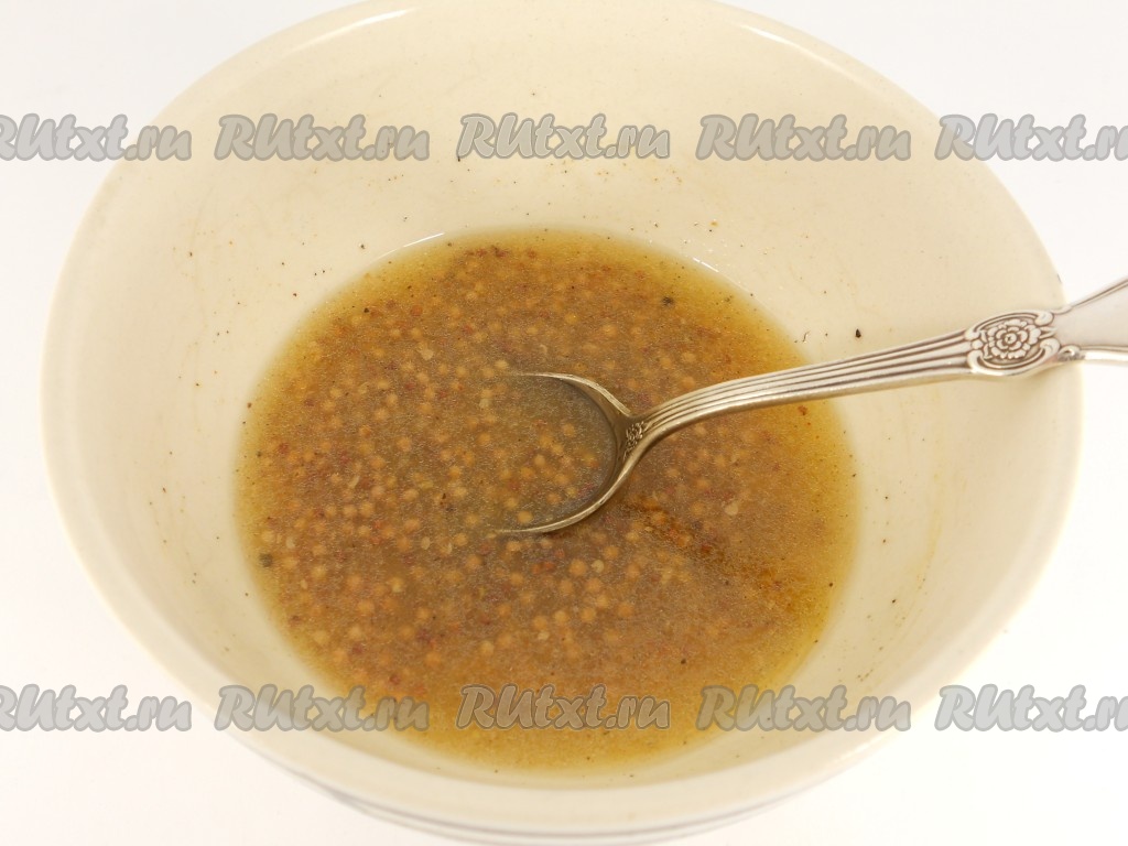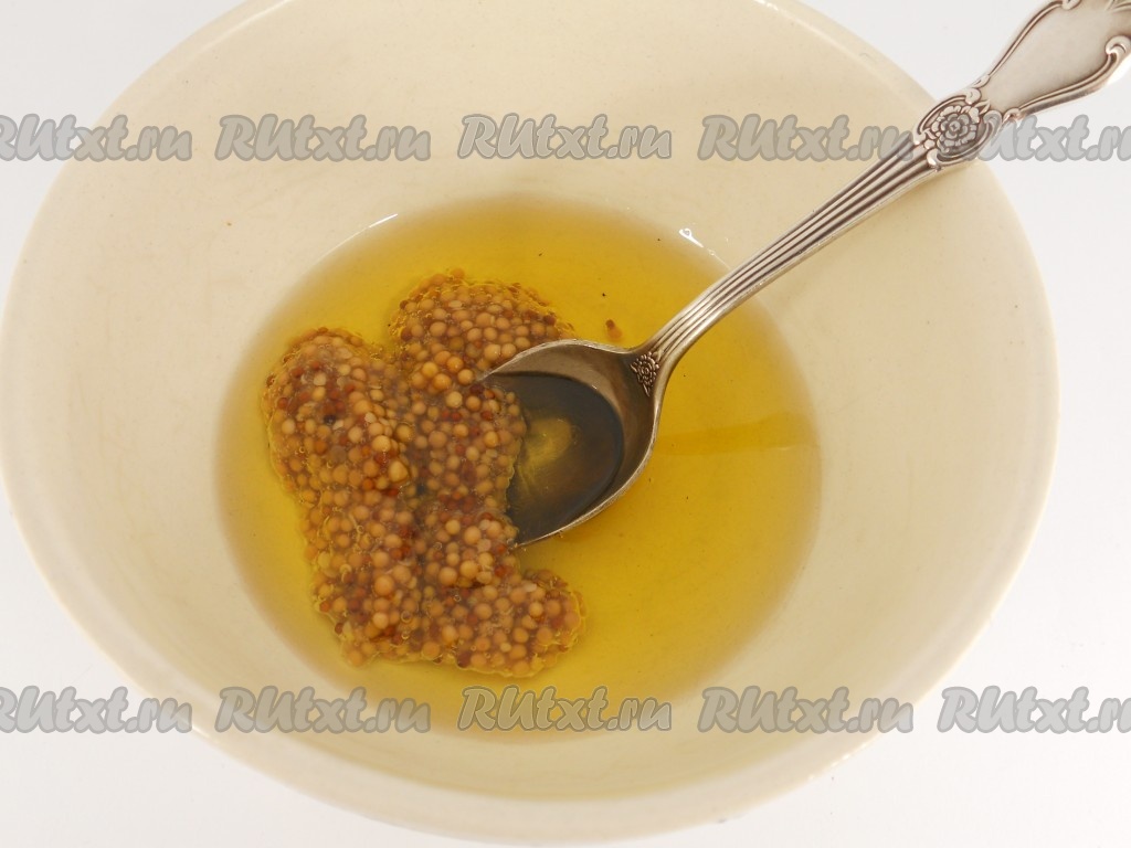 Для приготовления заправки нужно в глубокую миску влить растительное масло, добавить французскую горчицу.
