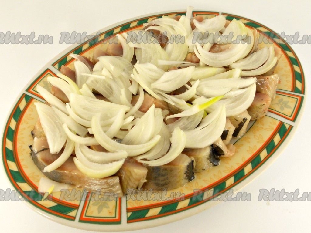 Очищенный лук нарезать на тонкие полукольца, выложить поверх селёдки.