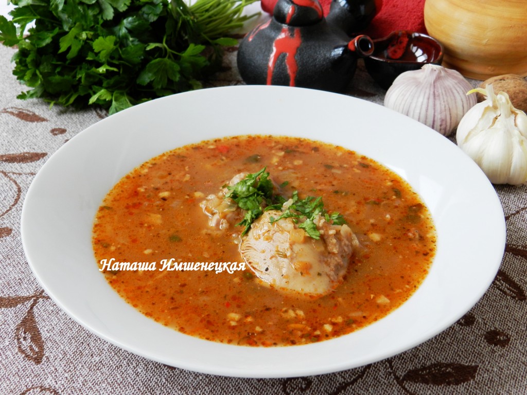 Традиционно грузинский суп харчо готовится на говядине, и чаще всего я готовлю именно такой харчо. Однако, для разнообразия, можно приготовить суп харчо с курицей и рисом. Не менее вкусный, очень ароматный, острый и пряный этот суп обязательно понравится вашим мужчинам!