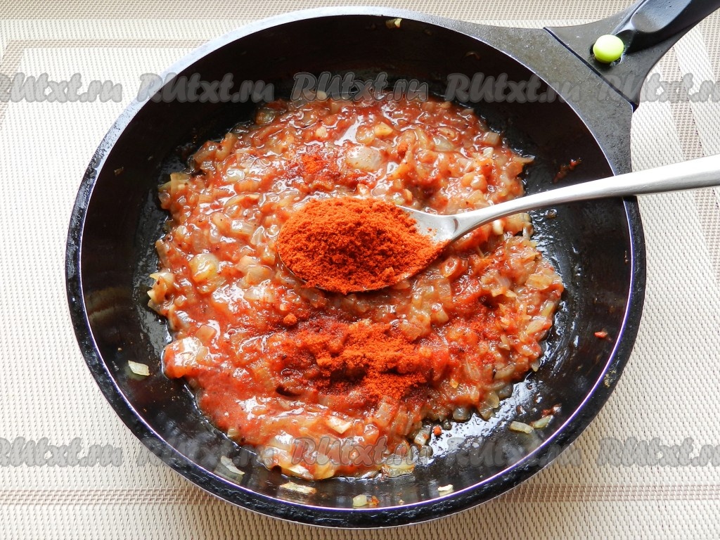 Добавить молотую паприку. Благодаря паприке харчо из курицы приобретет приятный красноватый цвет. Влить 2-3 столовые ложки бульона, перемешать, подержать на огне еще около 1-2 минут и отставить в сторону.