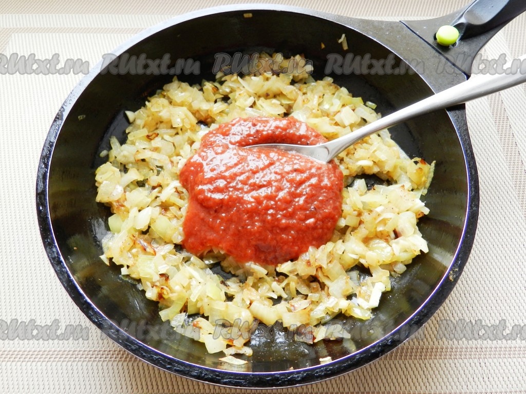 В сковороде разогреть растительное масло и обжарить лук до золотистого цвета, посолить и поперчить. Добавить чеснок, обжарить еще около 1 минуты. Затем добавить в сковороду соус ткемали, перемешать.