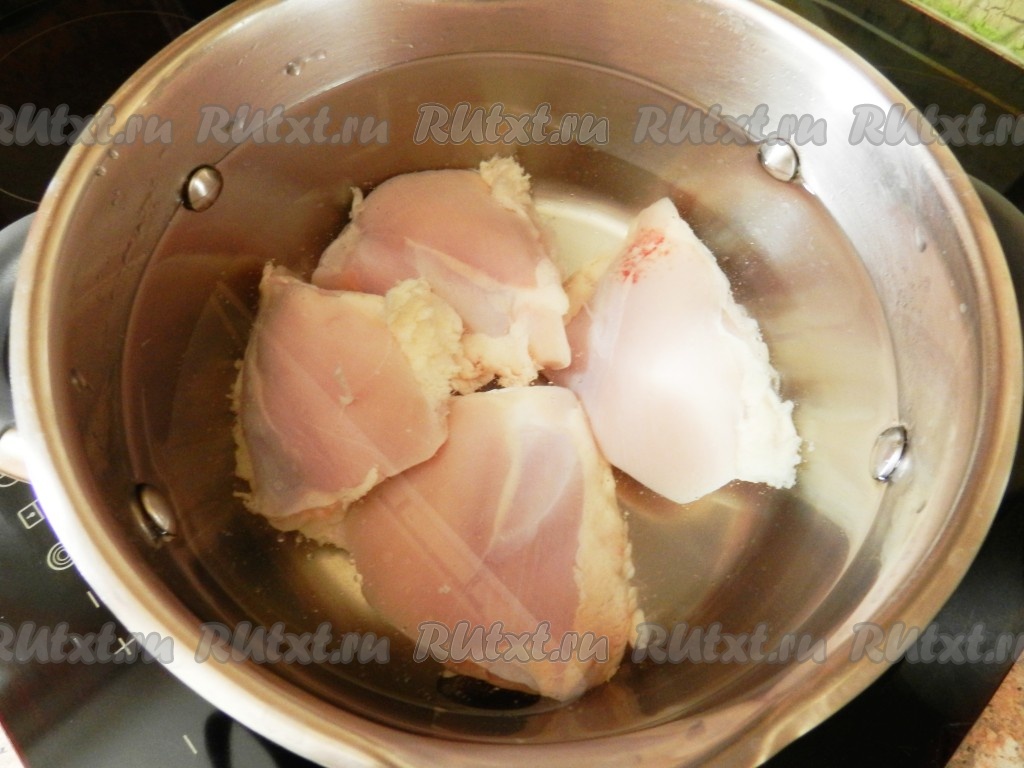 Куриные бедра вымыть, снять кожу, переложить в кастрюлю, залить 2-2,5 литрами воды и поставить варить. Когда вода закипит, снять пену и варить бульон в течение 45 минут.