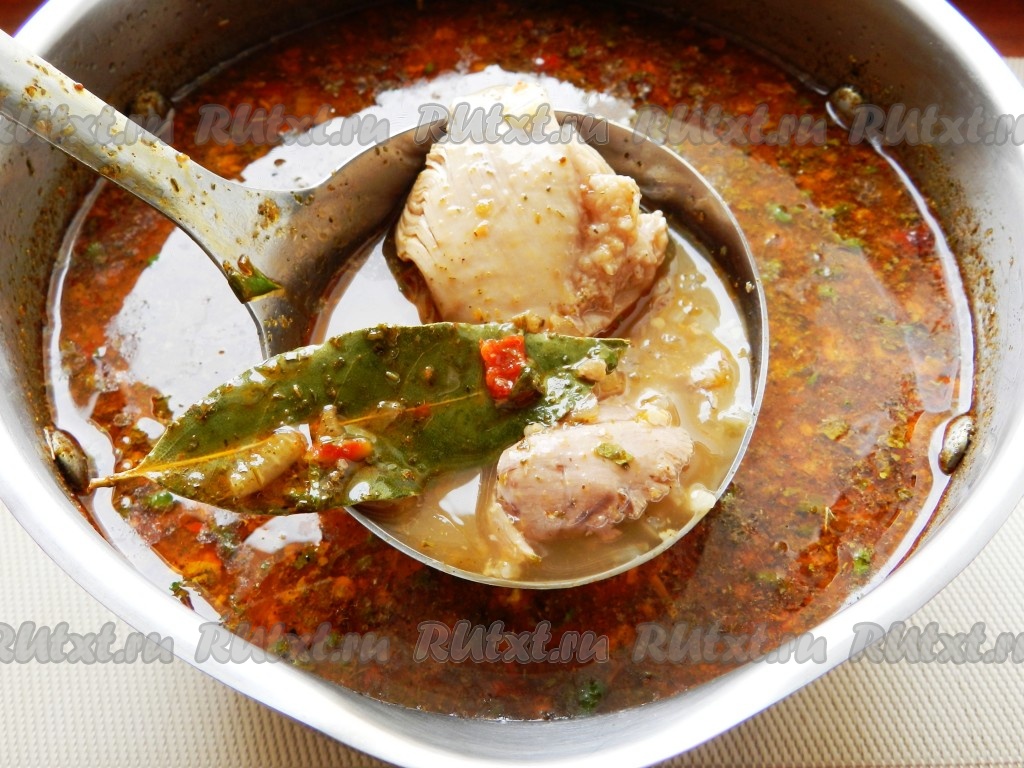 Ароматный, острый и очень вкусный суп харчо из курицы с рисом готов.