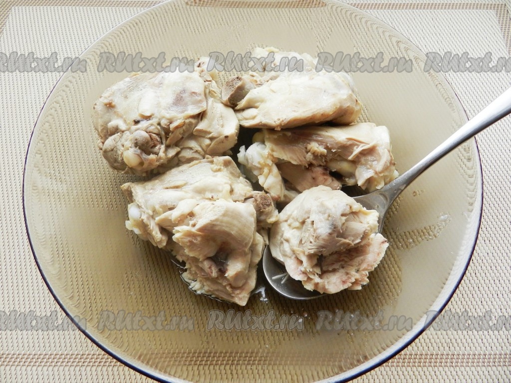 Когда курица сварится, вынуть ее из бульона, отделить мясо от костей и вернуть обратно в кастрюлю. Посолить по вкусу.