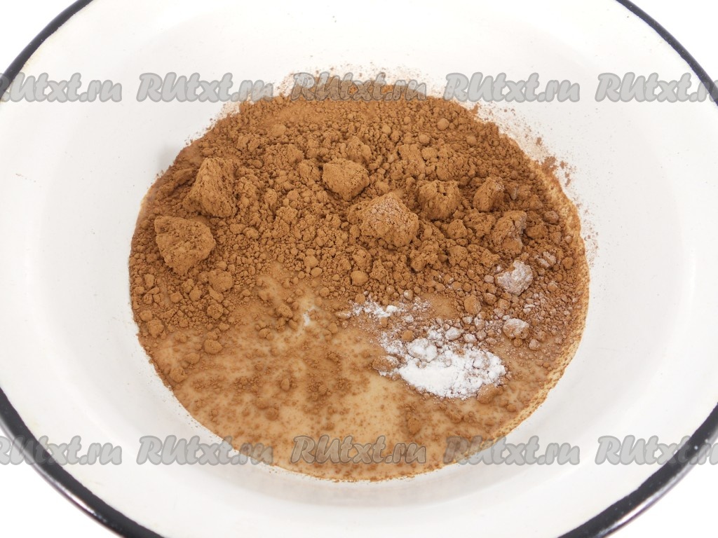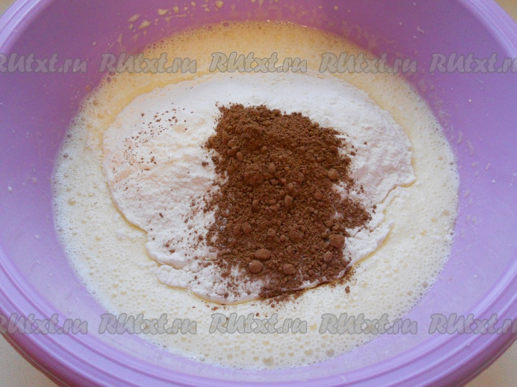 Всыпать просеянную муку и какао-порошок, хорошо перемешать ложкой или лопаткой до однородного состояния.