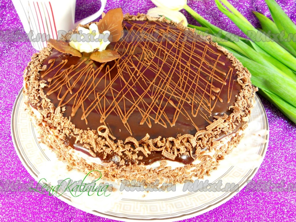 Шоколад (можно любой - молочный, черный) натереть на терке и обсыпать бока торта. Далее украсить по своему усмотрению. Торту дать настояться в холодильнике около 5-7 часов.