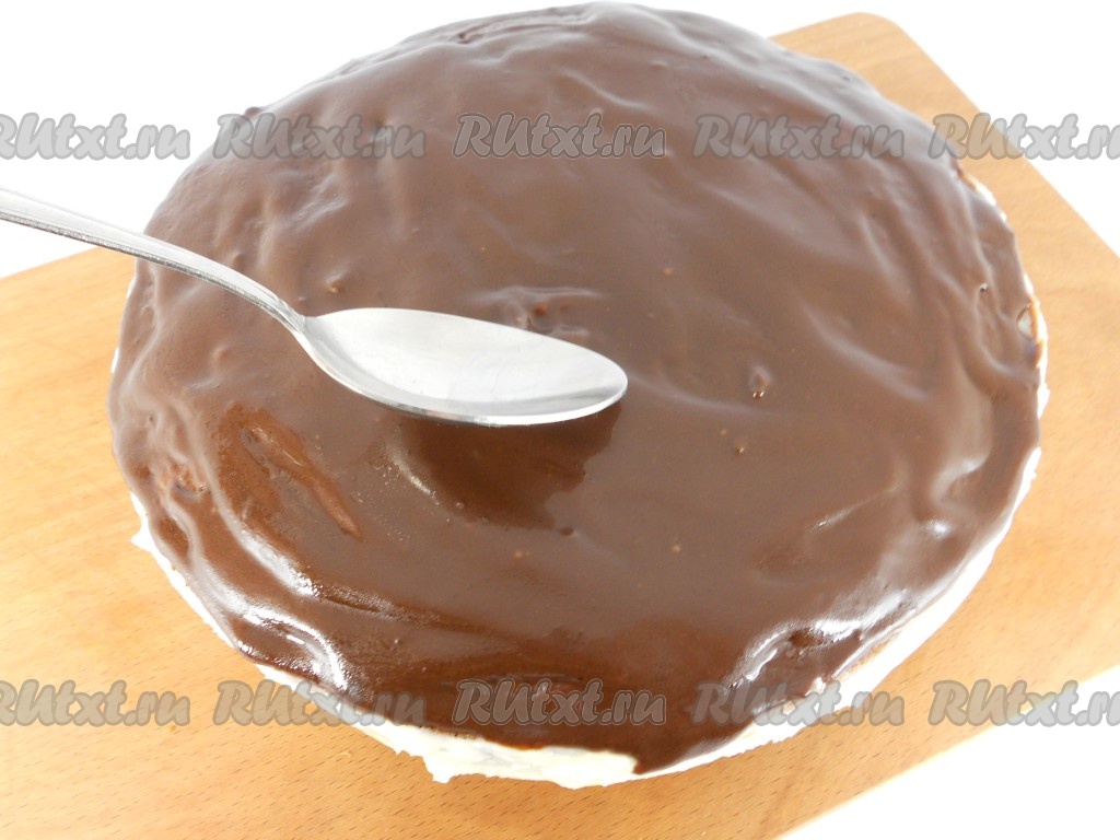 После этого добавить сливочное масло и прокипятить глазурь 3-4 минуты. Газ выключить, глазурь остудить. Покрыть равномерно шоколадной глазурью верх торта. Поместить торт "Прага" в холодильник до застывания глазури.