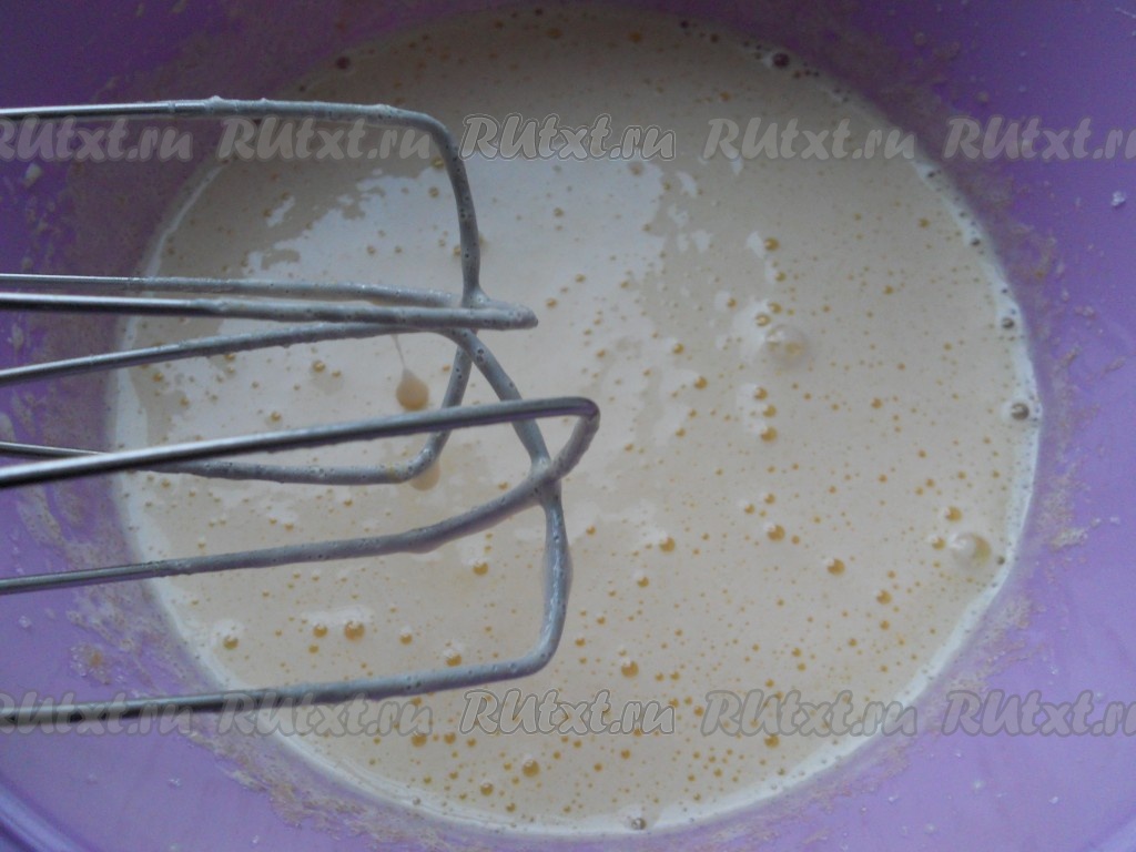 В другую посуду выложить сметану, добавить соду, взбить миксером. Продолжая взбивать, добавить сгущенное молоко. Соединить яичную и сметанную смеси вместе, еще немного взбить.