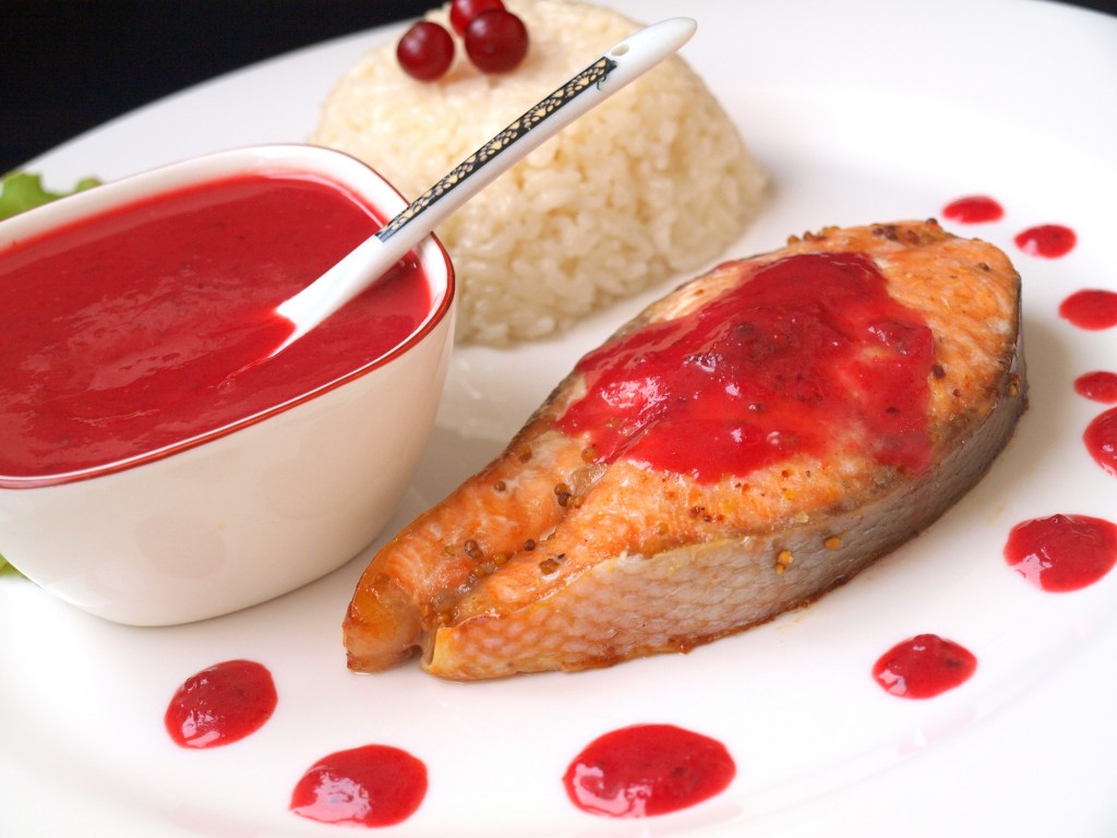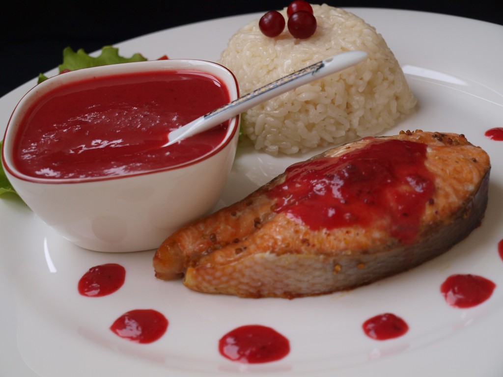 Стейки сёмги, запечённые в соевом соусе, достать из духовки, выложить на блюдо и подать к столу. Я подала с отварным рисом и клюквенным соусом домашнего приготовления. Рыбка получилась очень нежной и сочной.