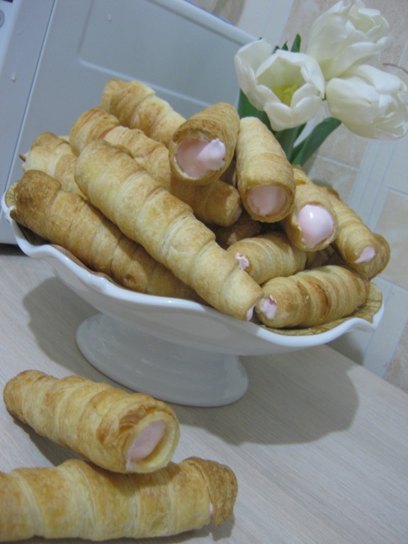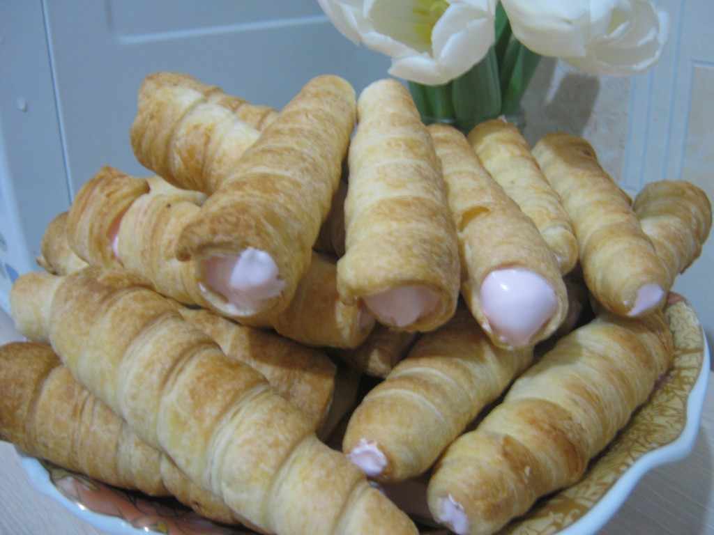 Наивкуснейшие трубочки из слоеного теста с желейно-белковым кремом готовы.
