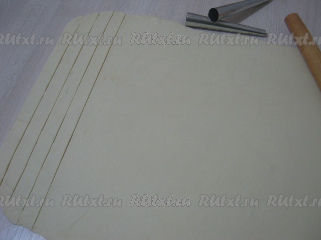 Из этого количества ингредиентов получается примерно 40-45 трубочек из слоеного теста с кремом. Слоёное тесто раскатываем в пласт толщиной 2-3 мм. Нарезаем тесто полосками шириной 2 см и длиной примерно 30-35 см.