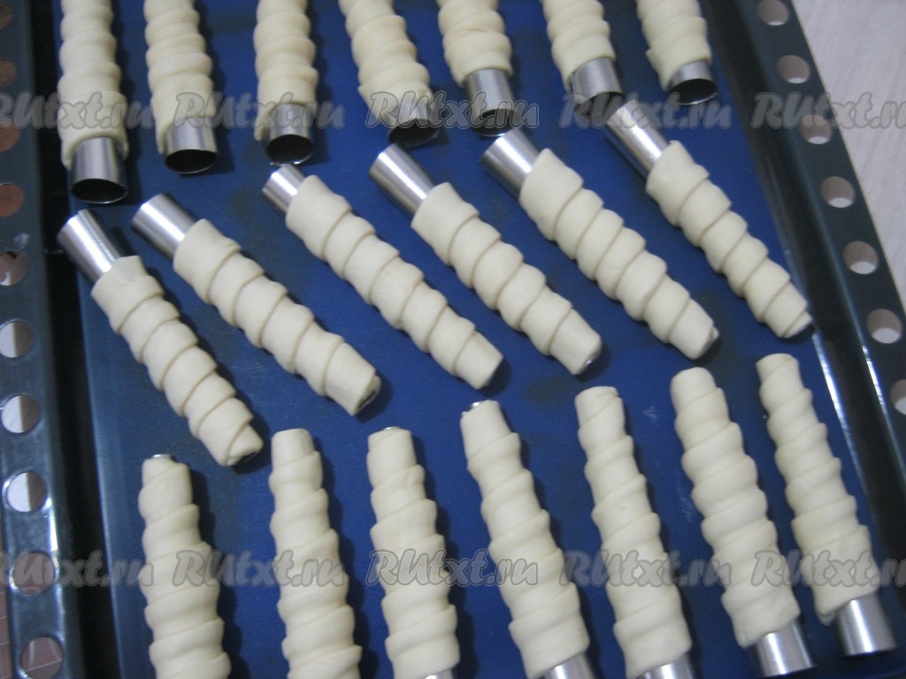 Металлические конусы протираем бумажной салфеткой, пропитанной растительным маслом. Каждую полоску теста накручиваем спиралью, начиная с узкой стороны конуса, внахлёст 3-4 мм.