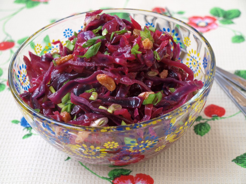 Салат из краснокочанной капусты заправляем оливковым маслом, добавляем изюм и перемешиваем. Посыпаем при подаче порезанным зелёным луком. Салатик получается полезным и вкусным.