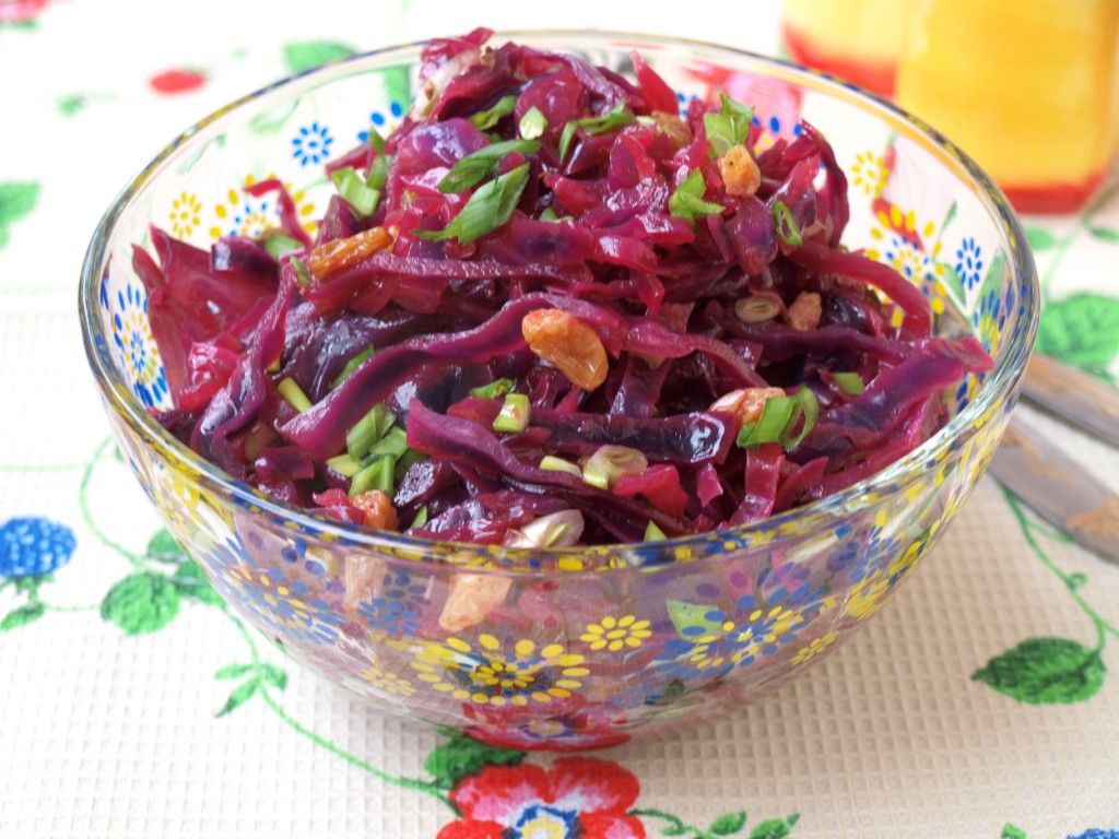Хочу поделиться рецептом приготовления вкусного салата из краснокочанной капусты с изюмом. Блюдо станет прекрасным дополнением к семейному обеду или ужину. В этом рецепте краснокочанную капусту можно использовать и свежую, и слегка отваренную. Я пробовала оба варианта, и результат получился прекрасным. Хотя вкус блюда, конечно, будет слегка отличаться.