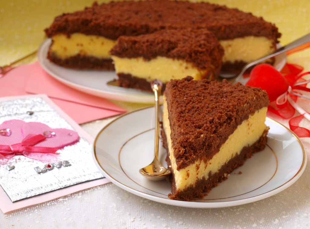 Затем насыпаем оставшуюся шоколадную крошку, равномерно покрывая творожный слой. Выпекаем королевскую ватрушку с творогом и какао 45 минут в духовке, заранее разогретой до 190 градусов.