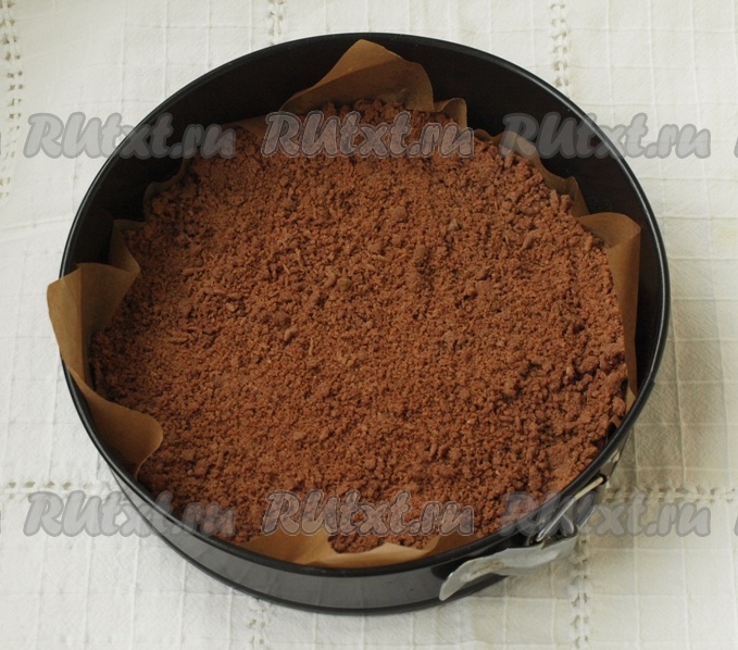 К получившейся масляной массе добавляем муку, какао и тщательно перетираем руками до получения мелкой, однородной шоколадной ("торфяной") кроши. Половину получившейся шоколадной крошки выкладываем в разъёмную форму для выпечки (у меня форма диаметром 24 сантиметра), застеленную пекарской бумагой.