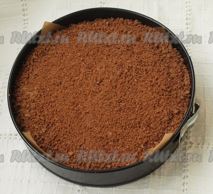 Выкладываем на слой шоколадной крошки творожный слой, разравниваем.