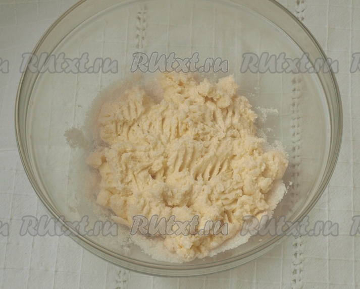 Прежде всего сделаем тесто-крошку, для этого в достаточно объёмную миску выкладываем мягкое (комнатной температуры) сливочное масло, всыпаем сахар, растираем вилкой до однородности.