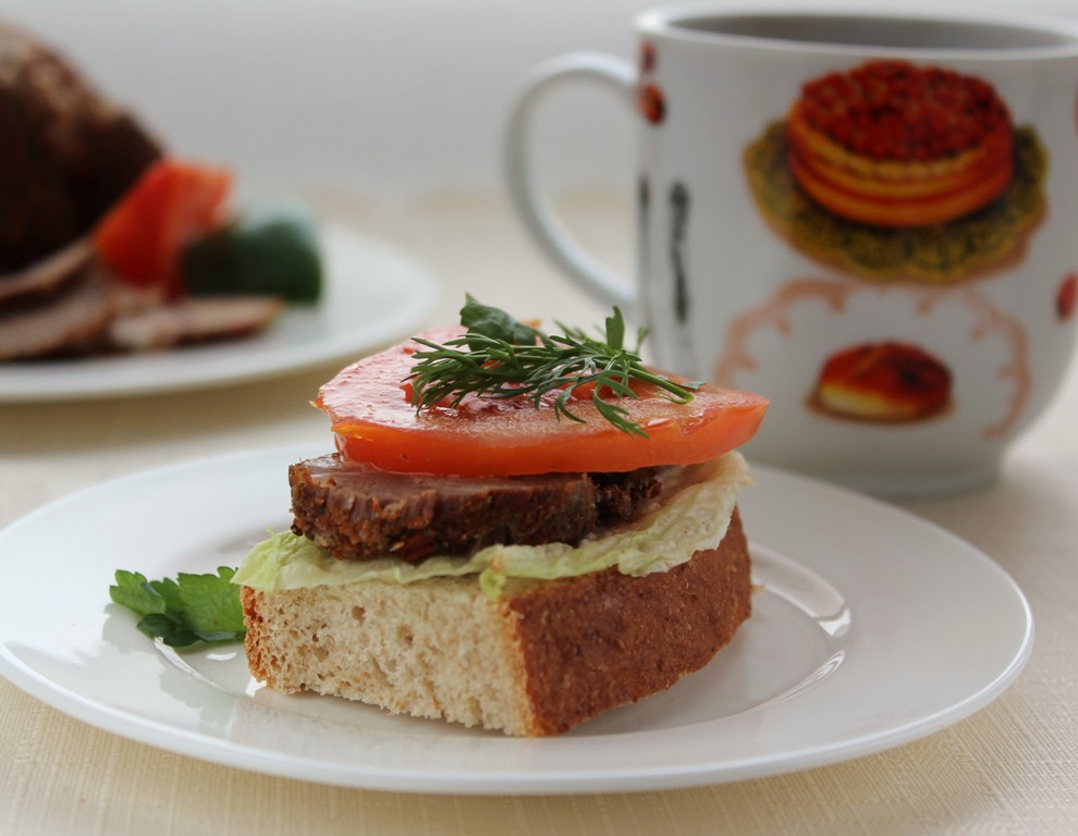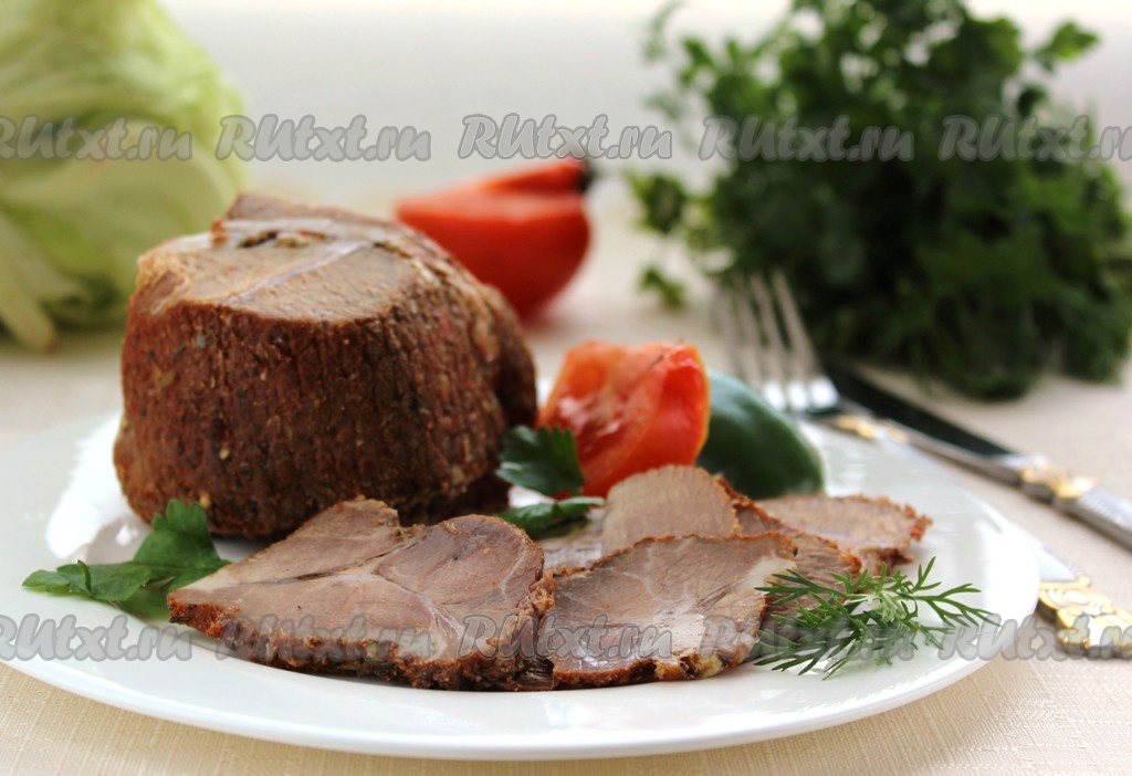 Мясо получается плотное и нежное, хорошо нарезается на тонкие ломтики.