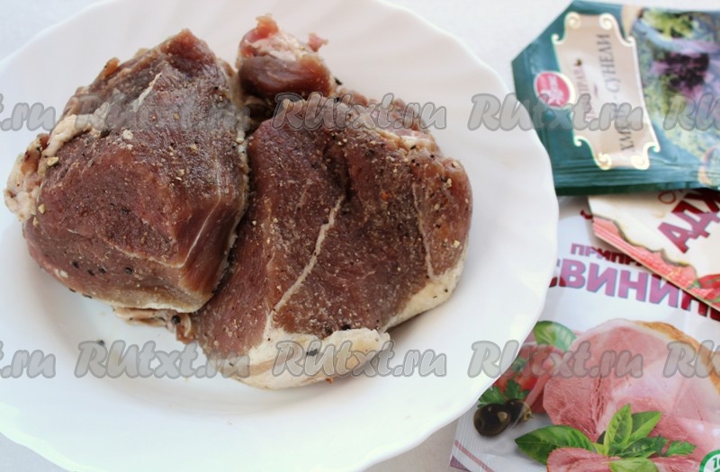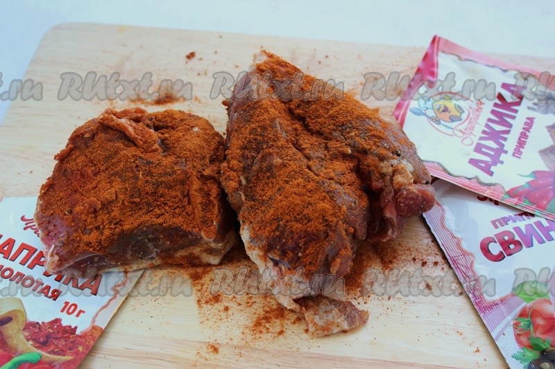 По истечении срока, достаем мясо из холодильника, приготовим специи, которыми щедро посыпаем свинину.