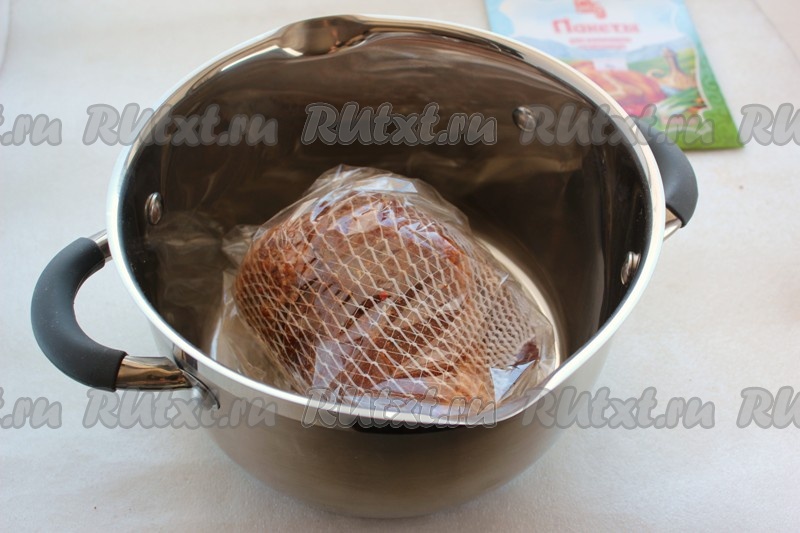 Далее подготовленное мясо укладываем в пакет для запекания, хорошо завязываем, вода не должна попасть в пакет, для страховки лучше поместить мясо в 2 пакета.