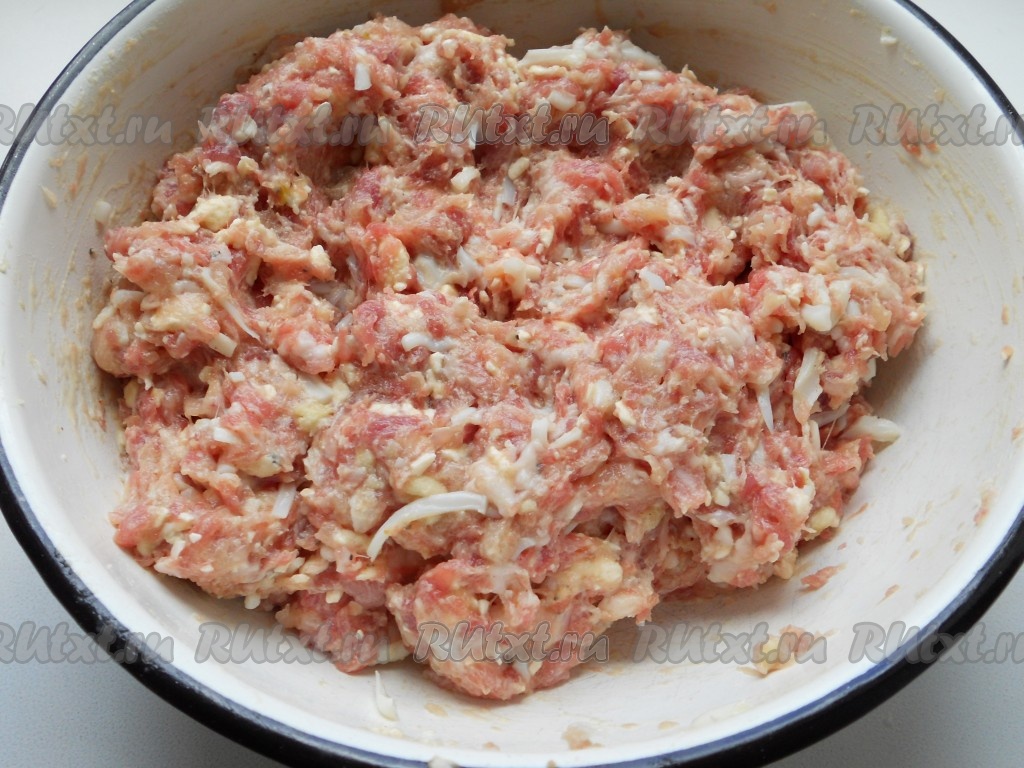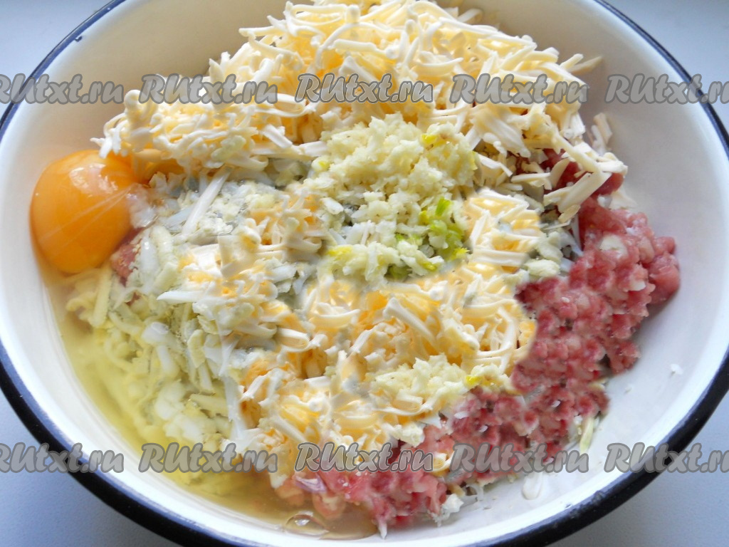Добавить к свиному фаршу натёртый на крупной тёрке сыр, сырое яйцо и чеснок, пропущенный через пресс.