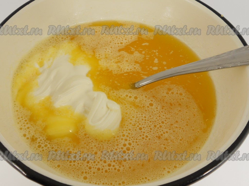 Перелить взбитые яйца в миску с маргарином и сахаром, добавить сметану, тщательно перемешать.