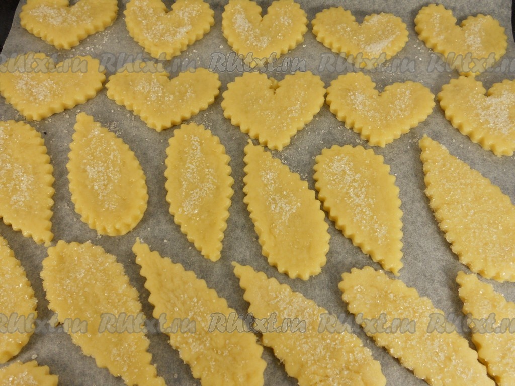 Разделить тесто на 3 части, каждую часть обернуть пищевой плёнкой и поместить в холодильник на 30 минут. Далее каждую часть поочередно доставать из холодильника, на присыпанной мукой поверхности раскатывать в пласт толщиной около 0,5 сантиметров. Вырезать выемками для печенья различные фигурки. Обмакнуть одну сторону печенья в сахар или посыпать сверху. Противень застелить пергаментом и выложить на него печенье.