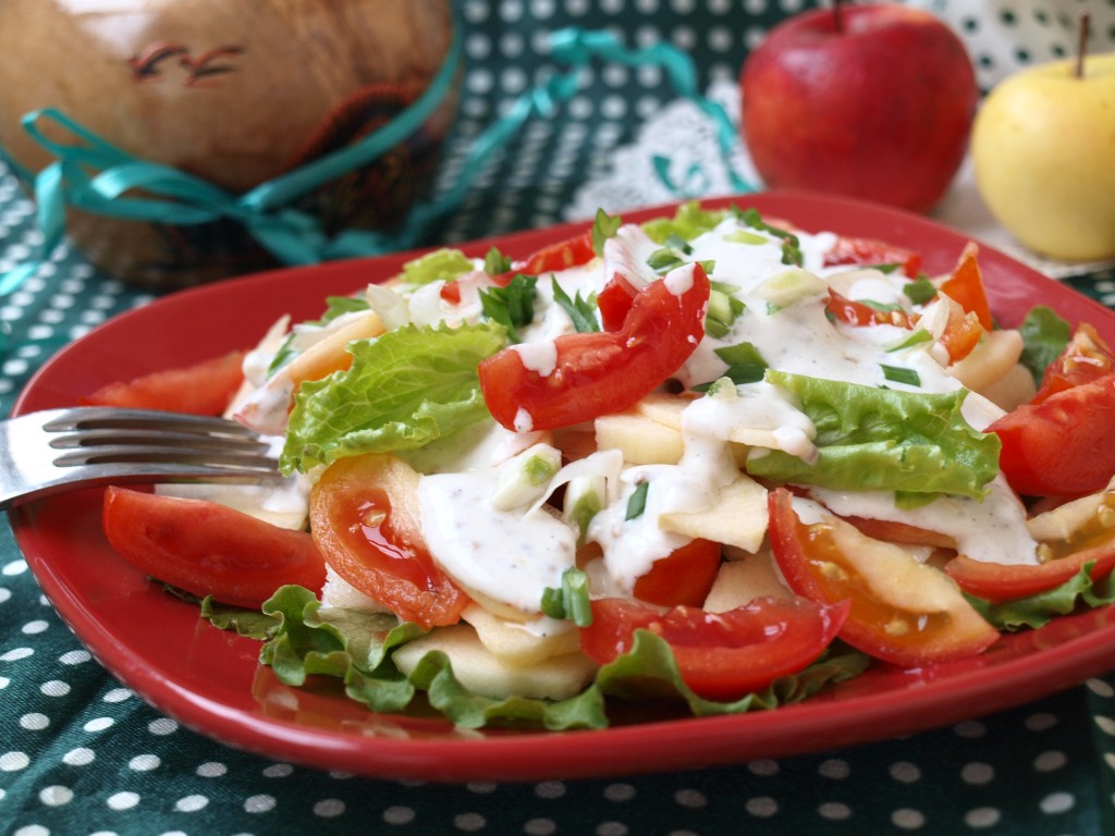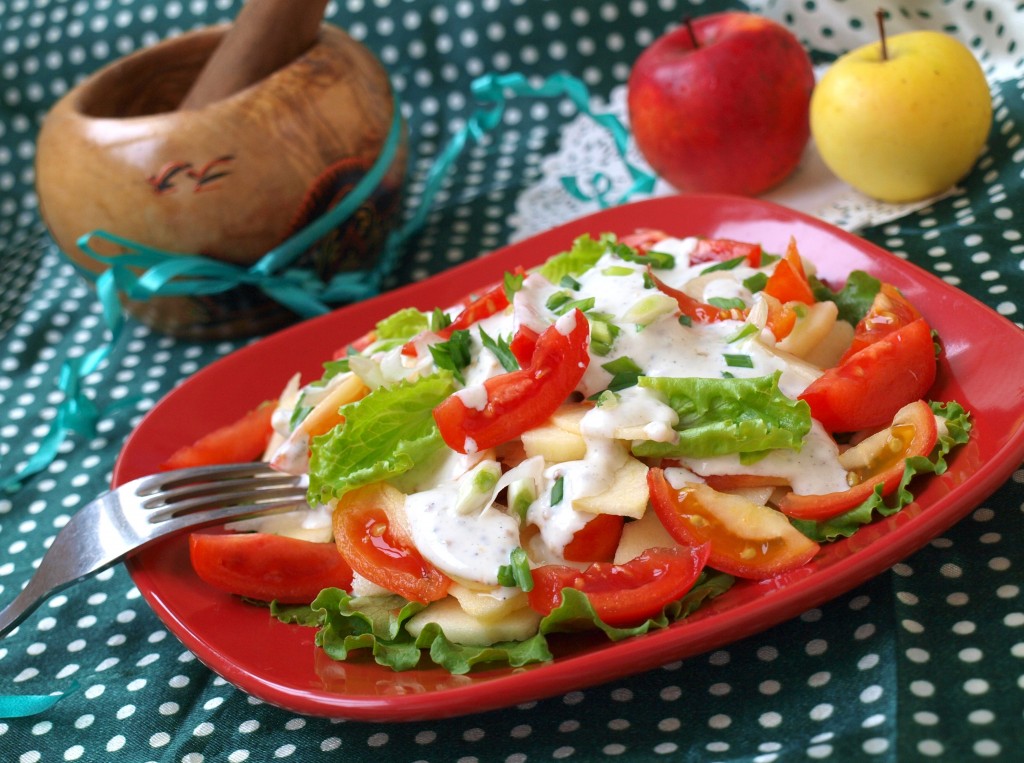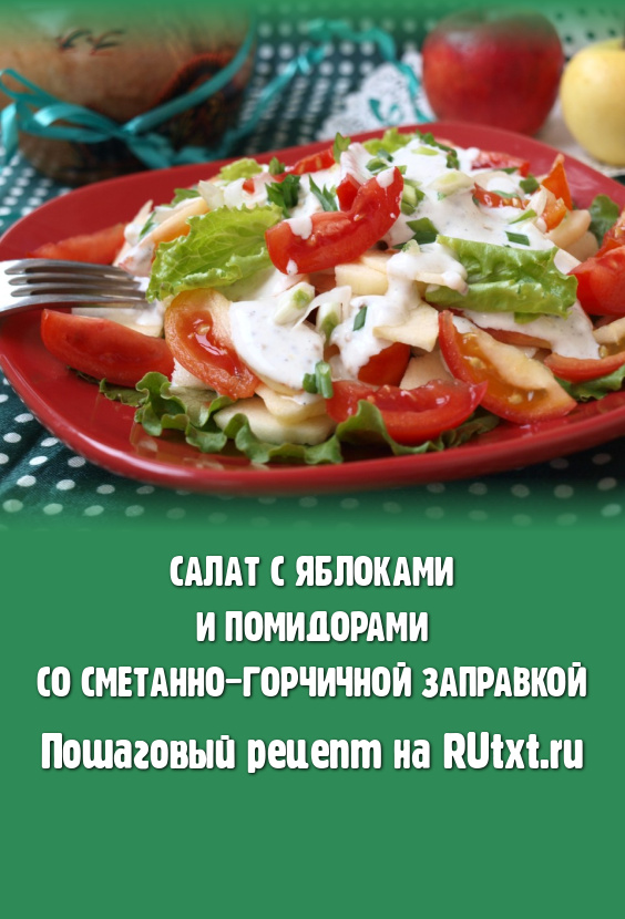 Полить салат с яблоками и помидорами сметанно-горчичной заправкой и посыпать порезанным зелёным луком. Наш великолепный салат готов!