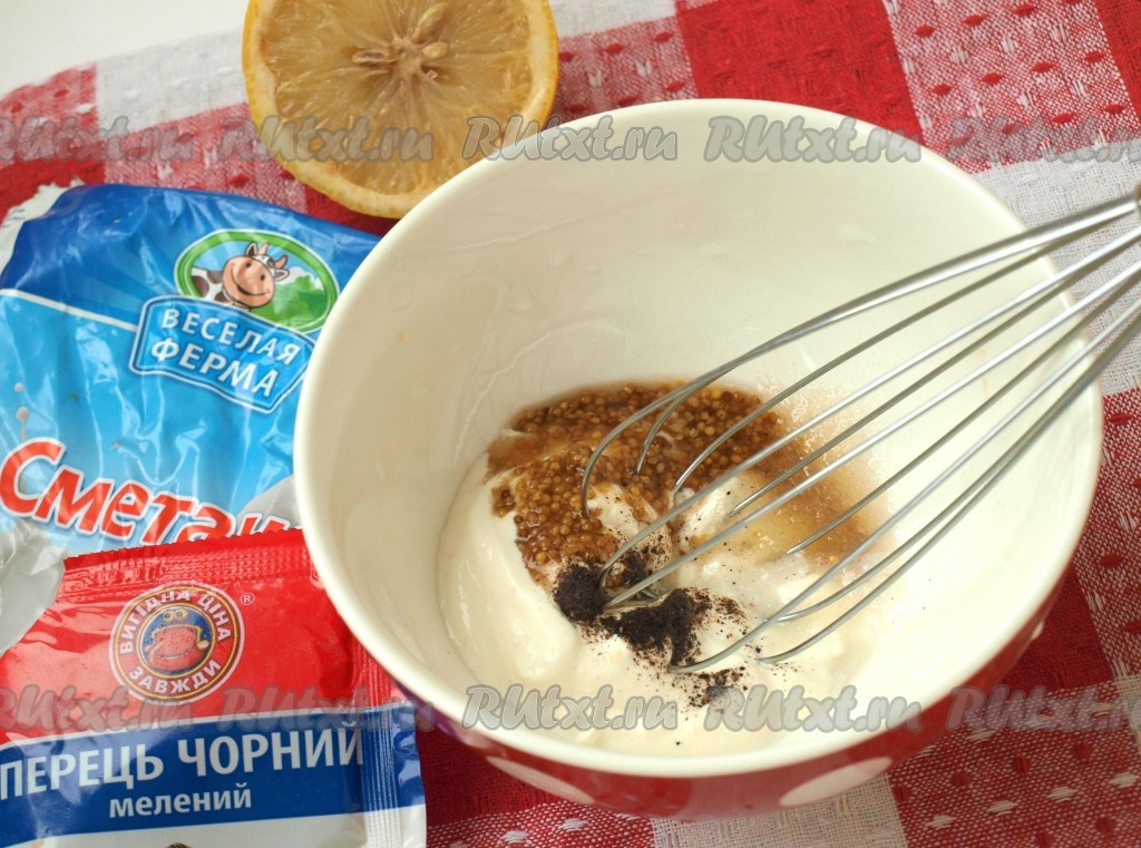 Сметану, сахар, соль и чёрный перец, французскую горчицу, лимонный сок взбить венчиком до однородной массы.