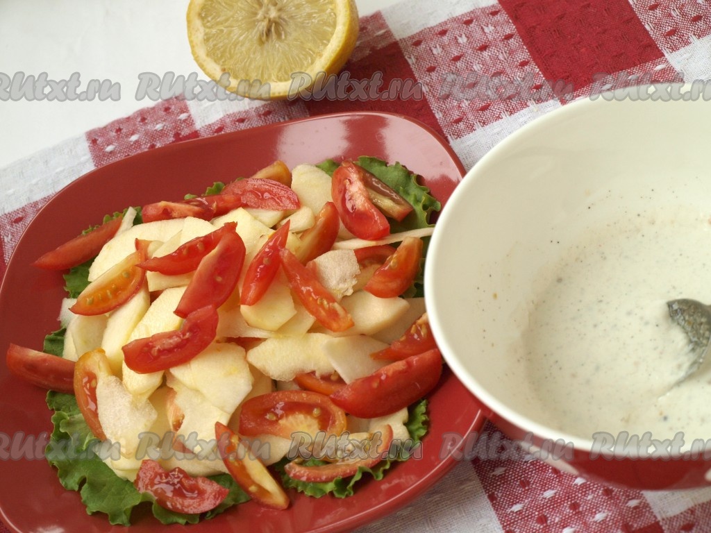 Потрясающий салат - лёгкий, освежающий и очень вкусный! Это блюдо особенно понравится тем, кто заботится о своей фигуре. В салат с яблоками и помидорами входят простые ингредиенты, да и приготовить его очень просто!