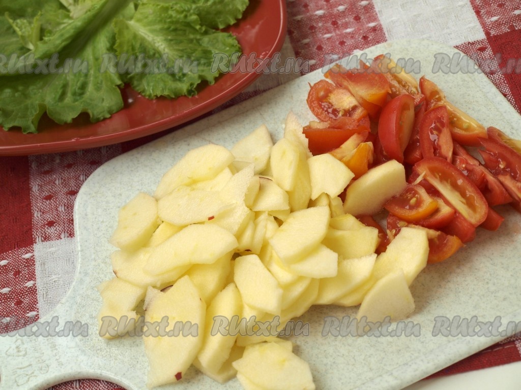 Помидоры нарезать ломтиками. Также нарезать яблоки, очищенные от кожуры и семечек.