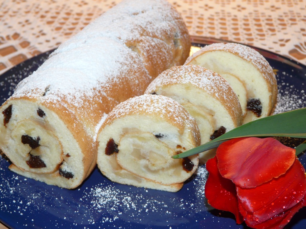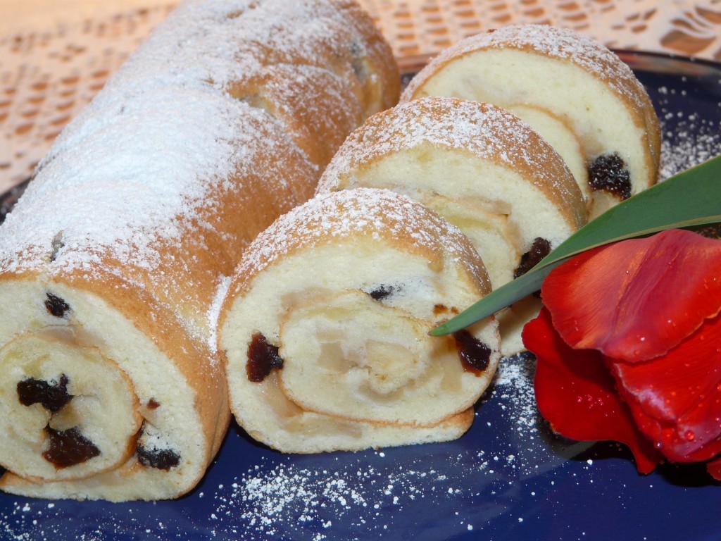 После остывания бисквитный рулет с яблоками можно посыпать сахарной пудрой. Нежную, воздушную выпечку нарезать на части и подать к чаю. Вот так достаточно просто можно приготовить в духовке в домашних условиях отличный рулет!