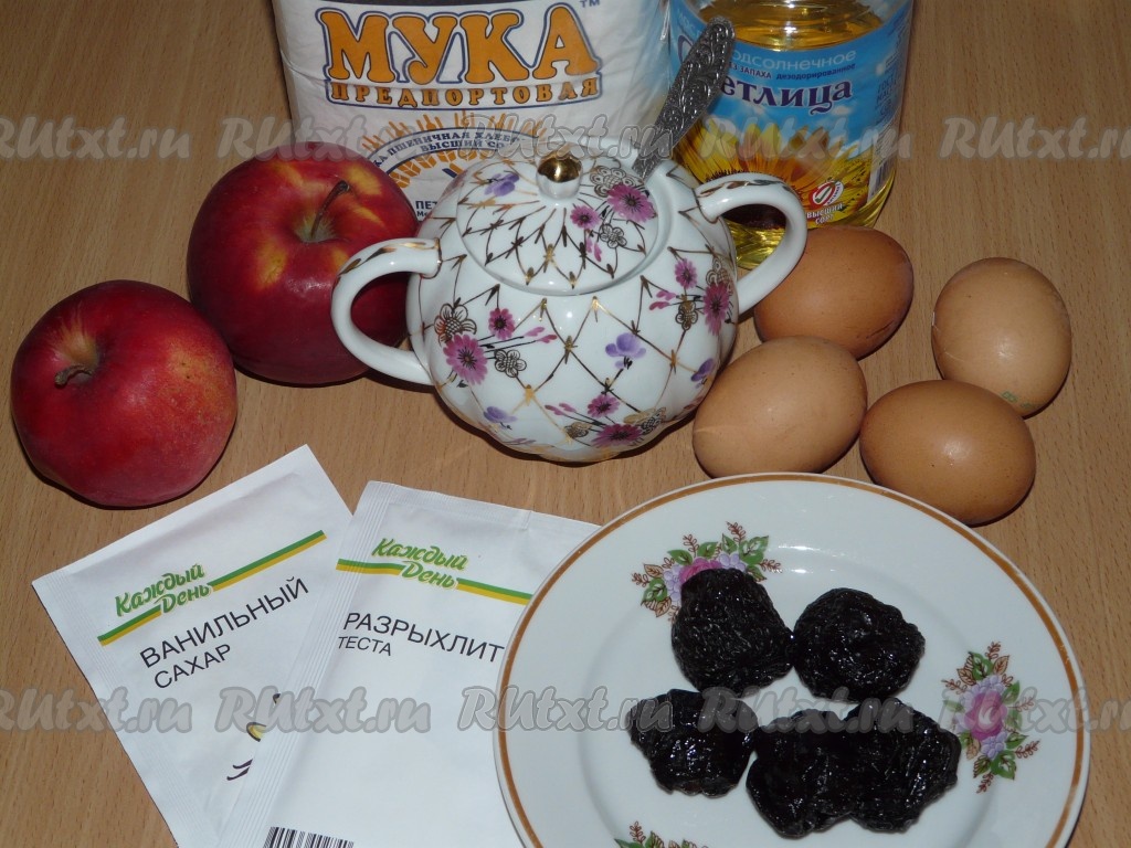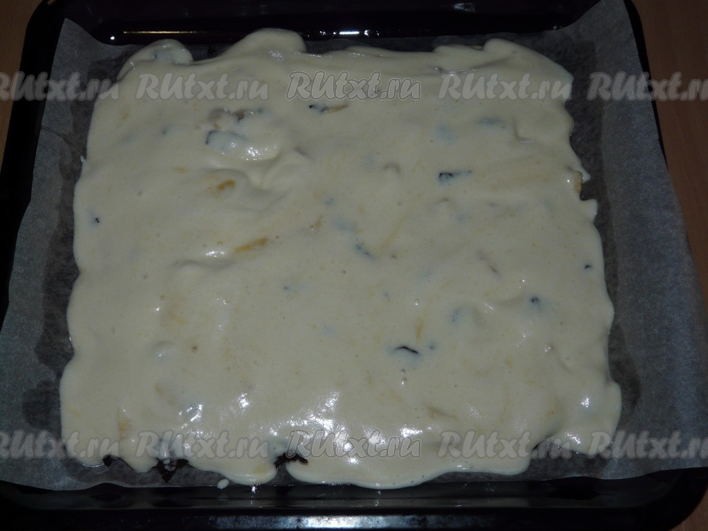 Равномерно залить яблоки и чернослив тестом.