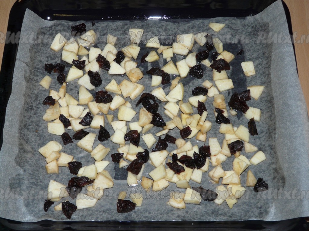 Противень (у меня противень размером 30х35 сантиметров) застелить пергаментной бумагой. Смазать бумагу растительным маслом. На бумагу равномерно выложить яблоки и чернослив.