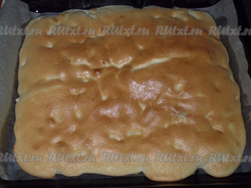 Поставить противень в разогретую до 180 градусов духовку, выпекать бисквитный корж минут 15 (до золотистой корочки).