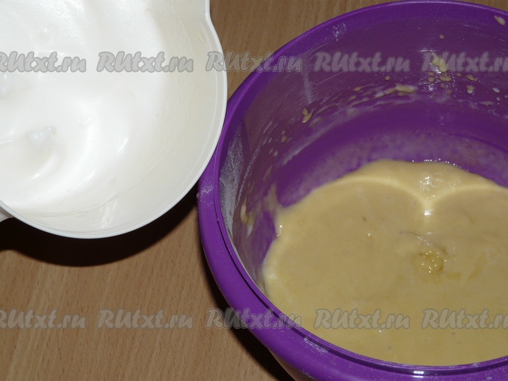 На максимальных оборотах миксера взбить белки в пену. Не прекращая взбивать миксером, постепенно добавляя к белкам сахар, взбить их до устойчивых пиков. В отдельной ёмкости взбить миксером желтки. В процессе взбивания желтки должны немного увеличиться, стать более светлыми.