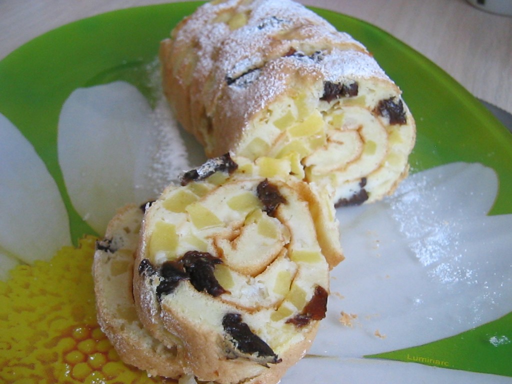 Достать противень из духовки. Испечённое тесто с фруктами перевернуть на тканевое полотенце, аккуратно убрать бумагу. В тёплом виде аккуратно завернуть бисквит с яблоками в рулет.