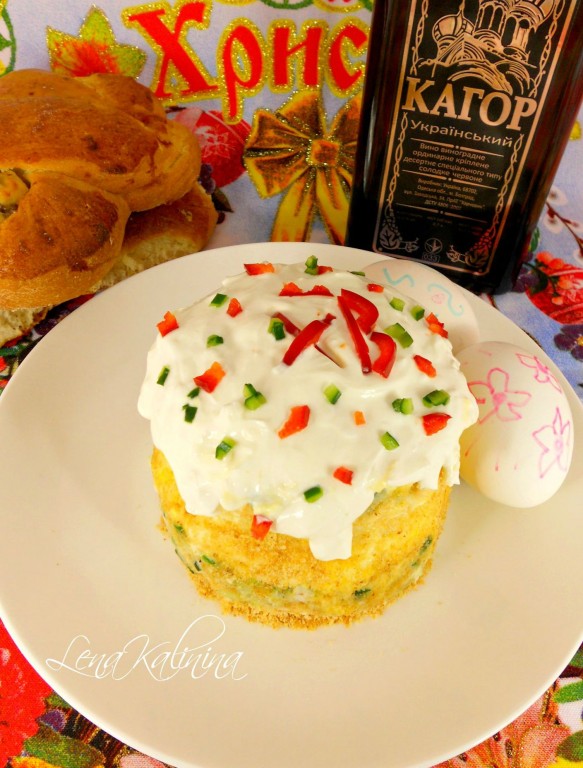 Бока салата обсыпать панировочными сухарями, а верх смазать сметаной, придавая форму глазури. Украсить этот замечательный, праздничный салат "Пасхальный кулич" вырезанными буквами из сладкого перца и кусочками свежих овощей, имитируя присыпку. Пасхальный салат-кулич готов!