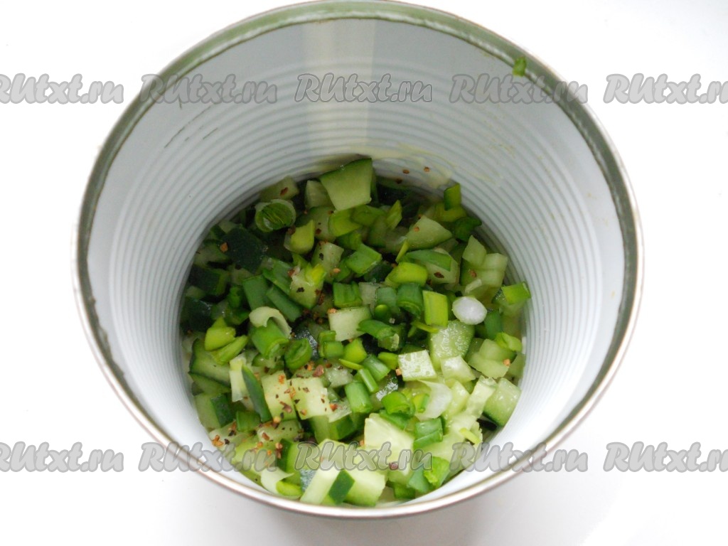 Второй слой - порезанные мелким кубиком свежие огурцы и измельченный зеленый лук. Посолить немного и поперчить.