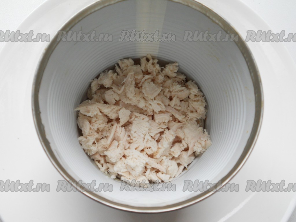Готовится салат очень просто - выкладывается слоями сразу на блюдо или тарелку с помощью специального кольца или обрезанной с двух сторон консервной банки. Куриное филе отварить в подсоленной воде, остудить, порезать небольшими кусочками и выложить первым слоем. Каждый слой не забывайте смазывать майонезом.