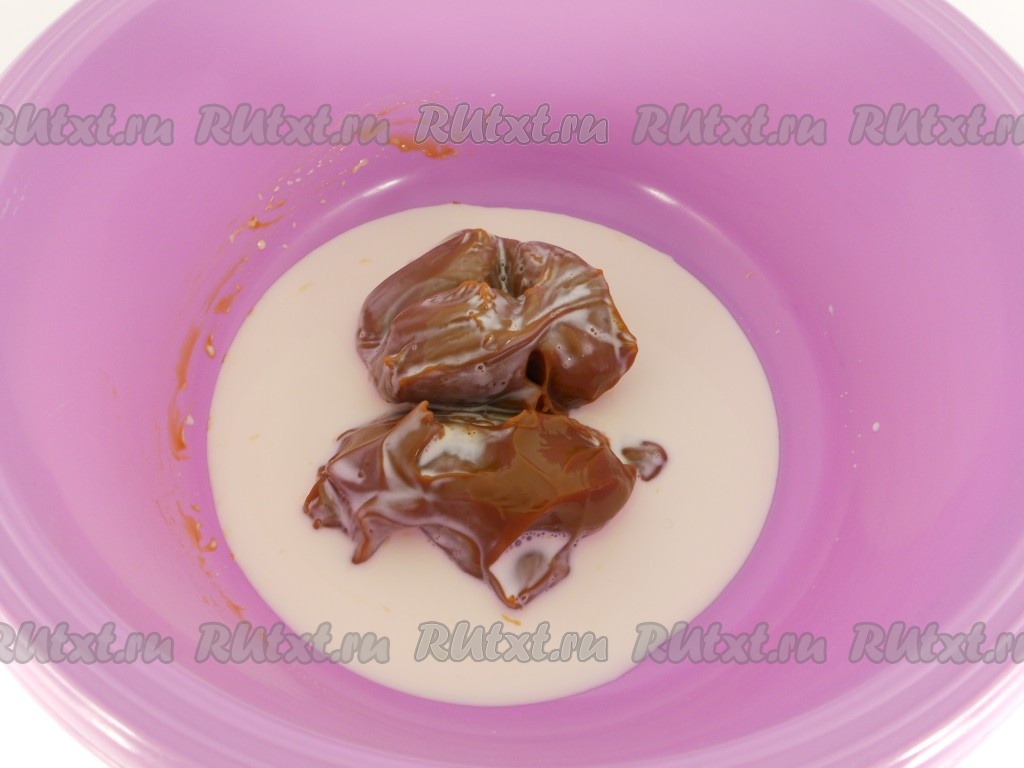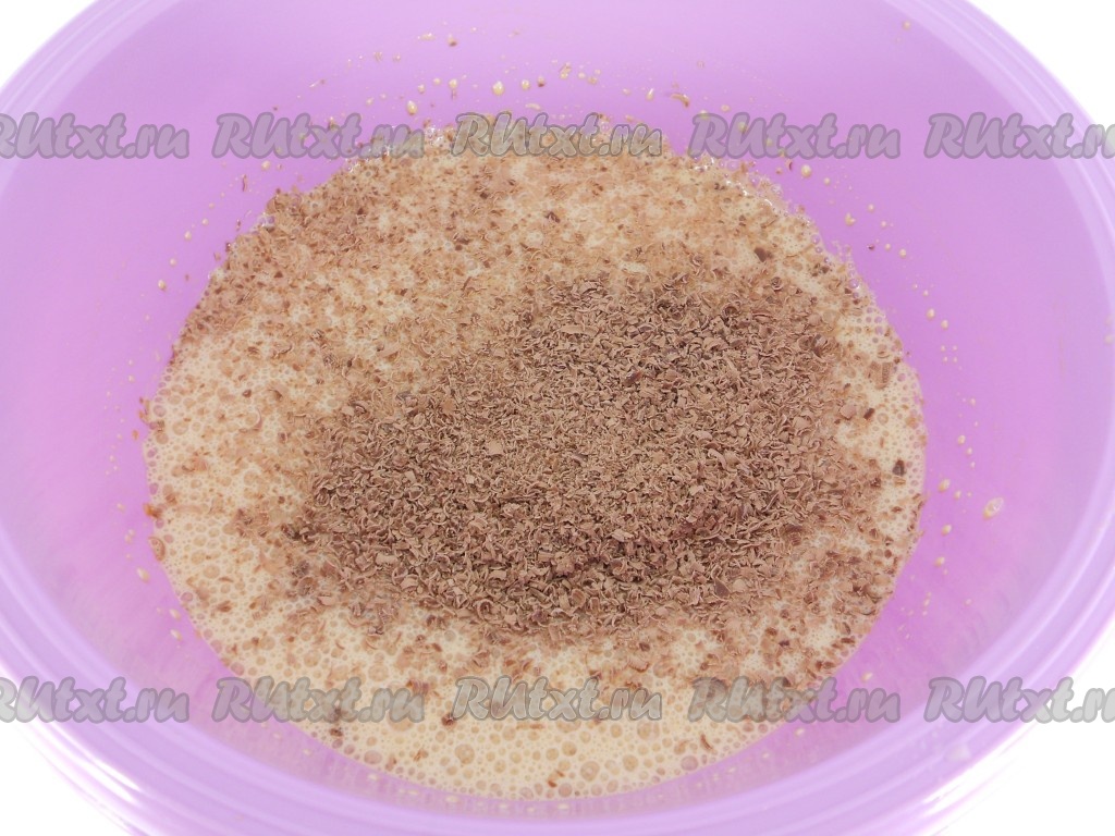 Перемешать, чтобы сгущёнка немного разошлась в сливках, затем смесь взбить миксером до пышной пены. В смесь сгущёнки и сливок добавить натёртый на крупной тёрке шоколад, взбить немного миксером.