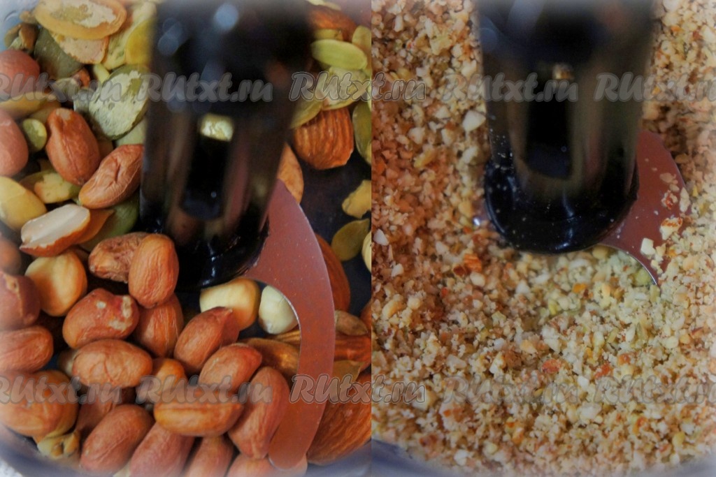Арахис и семена тыквы хорошо измельчить, почти в порошок.