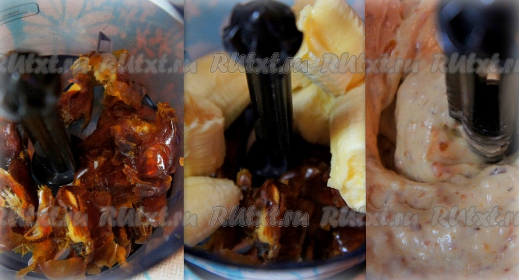 У фиников удалить косточку. Финики и банан положить в измельчитель и пробить до однородной массы (около 1 минуты).